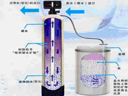 该产品是采用强酸性苯乙烯系钠型树脂(NaR)将原水中的硬度成分Ca2+、Mg2+置换出去,使原水得到软化,其反应为:2NaR+Ca2+(Mg2+)=R2Ca(Mg)+2Na+。当树脂置换到一定量的钙、镁后,就会失去置换能力;可以用一定浓度的盐水浸泡,使其恢复交换能力,其反应式为:R2Ca(Mg)+2Na+=2NaR+Ca2+(Mg2+)。再生过程包括:反洗(松动树脂层)—吸盐慢洗(置换过程)—正洗(将钙、镁离子冲掉)—注水(为下次再生准备)。